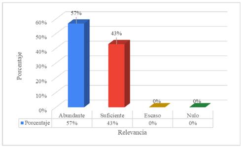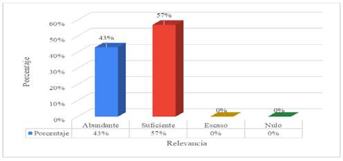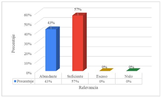 La figura 5 muestra que la competencia disciplinar de concientización sobre el manejo de recursos naturales y energías renovables fue considerada como abundante por el 57% de los egresados, mientras que el 43% la calificó como suficiente. No se reportaron respuestas en los niveles escaso o nulo.