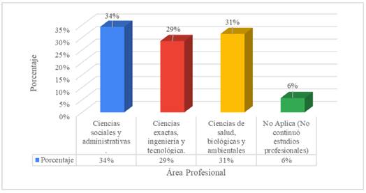 La figura 10 muestra la distribución de áreas profesionales en las que actualmente se forman los egresados. El 34% se encuentra en ciencias sociales y administrativas; el 31%, en ciencias de la salud, biológicas y ambientales; el 29%, en ciencias exactas, ingeniería y tecnología; y el 6% restante no cursa actualmente estudios superiores.