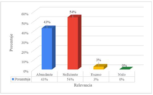 La figura 3 muestra que la competencia disciplinar con relación al desenvolvimiento de comunicación verbal y no verbal fue considerada como suficiente por el 54% de los egresados, mientras que el 43% la calificó como suficiente y 3% como escaso. No se reportaron respuestas en el nivel de nulo.