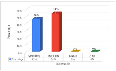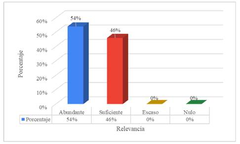 La figura 6 muestra que la competencia disciplinar de habilidades socioemocionales de responsabilidad social, colaboración ciudadana y educación para la salud fue considerada como suficiente por el 54% de los egresados, mientras que el 46% la calificó como abundante. No se reportaron respuestas en los niveles escaso o nulo.