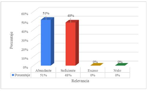 La figura 7 muestra que la competencia disciplinar de uso e indagación de información por medio digitales y tecnológicos fue considerada como abundante por el 54% de los egresados, mientras que el 46% la calificó como suficiente. No se reportaron respuestas en los niveles escaso o nulo.