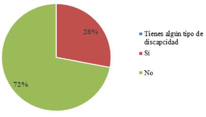 Al cuestionar si presentan algún tipo de discapacidad física o psicosocial, 42 estudiantes que representan el 72% respondieron no tener ningún tipo de discapacidad, aunque el 28% reportaron tener alguna discapacidad. Ver figura 1.