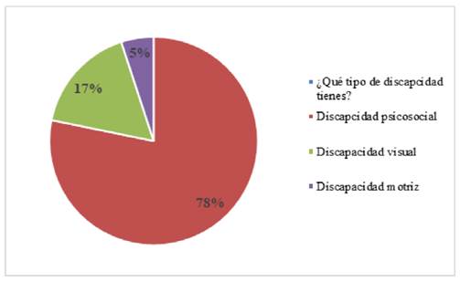 De los 18 estudiantes que se identificaron con alguna discapacidad, 14 señalaron presentar algún tipo de discapacidad psicosocial, 3 tiene discapacidad visual y uno discapacidad motriz. Ver figura 2. Entre la discapacidad psicosocial, señalaron estar diagnosticados con diversos trastornos como límites de la personalidad (TLP), consumo de sustancias psicoactivas, de personalidad, ansiedad, depresión, déficit de atención, obsesivo compulsivo, bipolar, estrés postraumáticos y autismo.