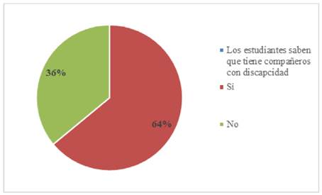Al preguntarles sobre si saben que tiene compañeros con alguna discapacidad, 41 (64%) respondieron que sí saben y conocen a algunos, aun cuando hay 23 alumnos (36%) que desconocen que tiene compañeros con alguna discapacidad, toda vez, que la discapacidad no es física o visible por ende no los identifican y cuando manifiestan actitudes consideradas inusuales, son percibidos como estudiantes problemáticos. Ver figura 3.