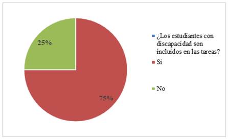 De los 64 estudiantes encuestados, el 75% revelaron que los compañeros que tiene alguna discapacidad física o psicosocial son integrados e incluidos en los equipos de trabajo que se organizan para la realización de tareas escolares sin ningún problema, aun cuando hay un 25% que respondieron que no incluyen a los compañeros con discapacidad en las tareas por equipo, toda vez que por su condición faltan mucho a las clases y no cumplen con su responsabilidad al cien por ciento. Ver figura 4.