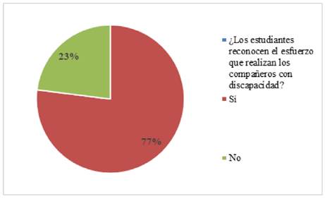 49 encuestados (77%) refirieron que a los compañeros que presentan algún tipo de discapacidad no se les valora ni se les reconoce el esfuerzo que realizan en el aula para poder cumplir con sus tareas, para algunos les son indiferentes y sólo una minoría de 15 estudiantes (23%) señalaron que sí reconocen el esfuerzo que hacen los alumnos con alguna discapacidad pues a pesar de no estar al 100% tratan de cumplir y estar en el aula a pesar de las dificultades que les representa, ver figura 6.