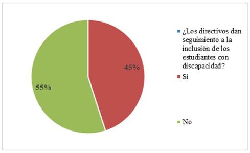 Todo ello ocurre ante la falta de información, lo que complica las relaciones sociales y la inclusión de este grupo de estudiantes. El trabajo de los directivos es de vital importancia para que haya una verdadera inclusión, sin embargo, de acuerdo a la encuesta un 55% de los estudiantes consideran que la UV a través de la dirección de la facultad sí da seguimiento a la inclusión de los estudiantes con alguna discapacidad sea física o psicosocial, mientras que, 29 de los participantes (45%) consideran que la dirección no da seguimiento a la trayectoria de estos estudiantes para acompañar su inclusión durante su ingreso, permanencia y egreso de las aulas universitarias, lo que hace más difícil el tránsito de estos alumnos, lo anterior tiene que ver con lo que señalan Molina et al., 2011, que el desafío consiste en “considerar en los planes, programas y proyectos de formación de cada universidad las necesidades, motivaciones y metas de las personas con discapacidad e integrar las políticas a sus reales condiciones de desarrollo personal, social, académico, vocacional y profesional”, situación que está lejos de llevarse a cabo en la facultad.