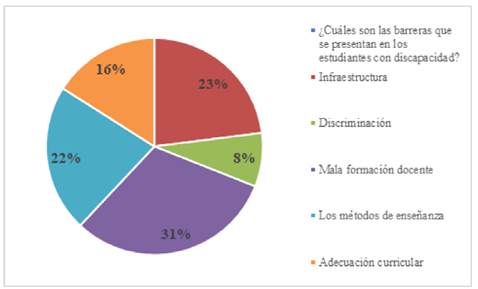 Con relación a las principales barreras a las que se enfrentan los estudiantes con discapacidad, el 31% respondieron que es debido a la poca preparación de los profesores, la falta de estrategias didácticas para atenderlos con calidad, no saben adecuar los contenidos de sus clases para facilitar el proceso de enseñanza-aprendizaje.
