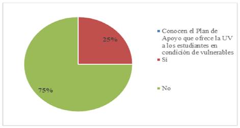Sobre los programas de apoyo que ofrece la Universidad Veracruzana a los estudiantes en condición de vulnerabilidad, contemplados en el Plan de Trabajo del Rector de dicha institución, existe una amplia difusión y diversas acciones de reforzamiento, como taller y conferencias que se realizan en las facultades, a pesar de ello, existe un desconocimiento por parte de la comunidad estudiantil, puesto que, de los 64 estudiantes encuestados sólo 16 señalaron conocer ese plan de apoyo, al tiempo que, un 75% de encuestados desconocen en qué consisten esos programas de apoyo; falta mayor información tanto dentro de la Universidad como fuera de ella, especialmente para la población que aspira a ingresar, “definir estrategias de atención a la diversidad nos ha llevado a reconceptualizar el término discapacidad como una restricción o ausencia relacionada con una deficiencia de la capacidad para realizar cualquier actividad que se conoce como normal para cualquier persona” (Cáceres, 2004).