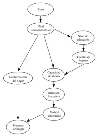Como se puede ver en la Figura 1, el objetivo de la red es analizar la influencia que tienen la zona de residencia, el nivel socioeconómico, el nivel de educación, la capacidad de ahorro y algunas variables más, pero directamente, la conformación del hogar y el manejo administrativo en las finanzas de las familias mexicanas.