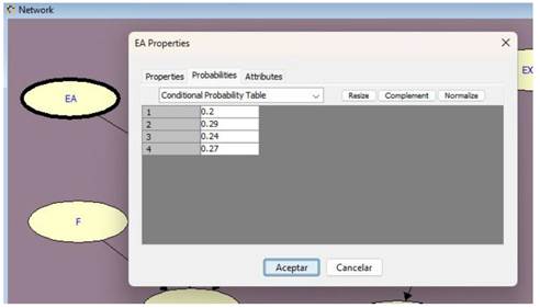 Una vez determinado el modelo y las relaciones causales en él, y con base en la información recopilada mediante el instrumento, se procedió a establecer la parametrización del mismo, con el fin de realizar las inferencias y conclusiones pertinentes. La Figura 3 muestra un ejemplo de la parametrización para el nodo de edad del estudiante (EA), siendo este un nodo padre de la red, es decir, sin antecesores. La parametrización se traduce como una tabla de probabilidad simple.