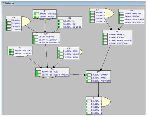 Reunida toda la información estadística obtenida de la base de datos, es posible obtener las probabilidades conjuntas de cada uno de los nodos, es decir, establecer la probabilidad general de cada variable tomando en cuenta la influencia de aquellos nodos antecesores a la variable de análisis. La Figura 4 muestra la red bayesiana con la parametrización completa inicial, donde se visualiza cómo se distribuyó la base de datos para cada una de las categorías de las variables.
