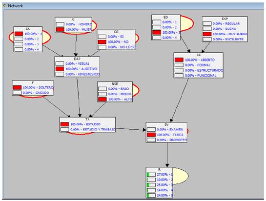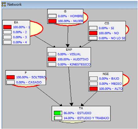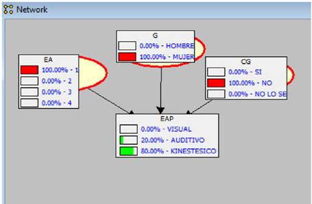 La influencia que tiene el que los estudiantes sean jóvenes, mujeres y que no tengan ninguna condición cognitiva es fuerte sobre el estilo de aprendizaje. Inicialmente, como lo muestra la Figura 4, el estilo de aprendizaje predominante es el auditivo, con una probabilidad de 36.22%; sin embargo, al considerar dichas características, el estilo de aprendizaje se ve considerablemente afectado, como lo muestra la Figura 5, siendo el estilo kinestésico el más prevalente, aumentando su probabilidad al 80%. El gran aumento en la probabilidad conjunta que tiene este estilo de aprendizaje permite establecer la ruta crítica del modelo, la cual va construyendo una conclusión que provee de gran información para el entendimiento del problema inicialmente planteado.