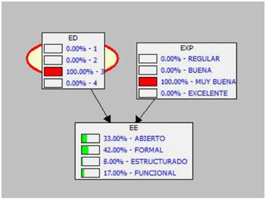 Los dos estilos de enseñanza con mayor influencia dentro del modelo son el abierto y el formal, con un 33% y 42% de probabilidad conjunta, respectivamente. Esto está determinado por el hecho de que los docentes cuenten con una experiencia sólida en el campo de la materia que imparten y que estén en un rango de edad entre los 56 y 70 años, lo cual también contribuye a que posean dicha experiencia. La influencia que estas variables ejercen en el estilo de enseñanza que se practica aumenta aproximadamente un 15%, haciendo una comparación entre los valores presentados en la Figura 4 y Figura 7. Esto representa un cambio significativo que marca la tendencia que va construyendo el modelo con base a las características que se va buscando en los docentes para el alcance del rendimiento académico de los estudiantes.