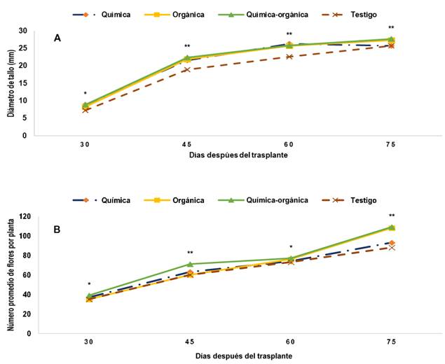 Para la evaluación del diámetro de tallo y número promedio de flores por planta se realizaron cuatro muestreos: a los 30, 45, 60 y 75 ddt. El diámetro de tallo (mm), se determinó con un vernier digital de la marca Truper® Stainless Steel, la medición se tomó a 2 cm por debajo de la primera horqueta. Mientras que el número promedio de flores se contabilizó de forma visual según el tratamiento. En el diámetro de tallo y número de flores se evaluaron a las mismas cuatro plantas.