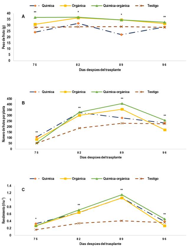 El rendimiento se determinó en cuatro cosechas: la primera a los 75 ddt, mientras que las cosechas posteriores se realizaron a intervalos de 7 días consecutivamente. El peso del fruto se determinó por tratamiento, utilizando una báscula digital de 3 kg marca Rhino®. El número de frutos se determinó contabilizando cada fruto cosechado por tratamiento, mientras que el rendimiento total se obtuvo pesando todos los frutos cosechados por tratamiento en una superficie de 153.33 m2, posteriormente se realizó una extrapolación a una superficie de 10 000 m2 para obtener el rendimiento en t ha-1.