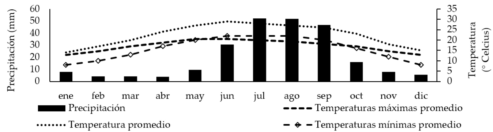 Los datos de temperatura y precipitación del año 2023 se obtuvieron de la caseta meteorológica de la cabecera municipal de Poanas, Durango (Figura 1). Los datos se analizaron mediantr ANOVA con el procedimiento PROC GLM de SAS versión 9.1 (SAS 2001) y las medias fueron agrupadas con la prueba de Tukey (α = 0.05).