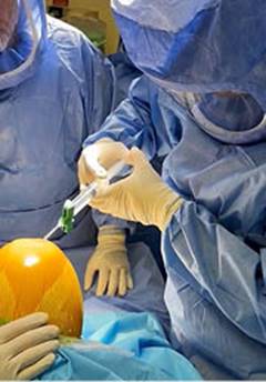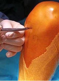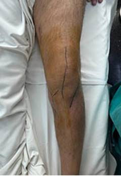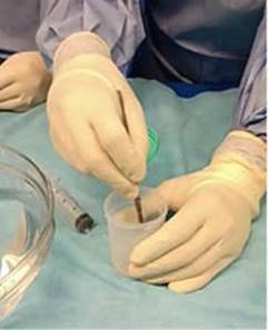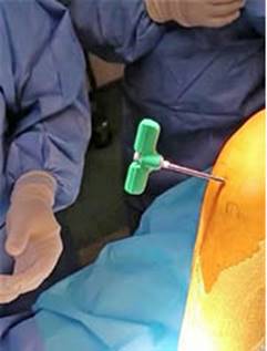Figura 3: Perforación del hueso metafisario proximal de la tibia, medial a la tuberosidad anterior de la tibia, con aguja de Jamshidi.