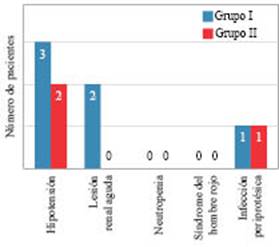 Conforme a los criterios de la guía clínica de KDIGO, dos pacientes del grupo I desarrollaron lesión renal aguda en el postoperatorio. Ambos tenían diagnósticos previos de enfermedad renal crónica (los dos en etapa II según la clasificación de KDIGO) y diabetes tipo II. Estos pacientes recuperaron los valores previos de función renal a las 48 horas. La enfermedad renal crónica y la diabetes se identificaron como los únicos factores predictivos de lesión renal aguda.