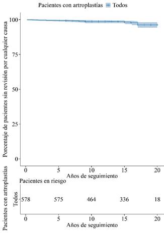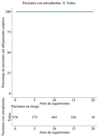 La Figura 4 muestra el análisis de supervivencia de los pacientes hasta la revisión por aflojamiento aséptico. A los 20 años no se presentaron eventos relacionados con el aflojamiento aséptico.