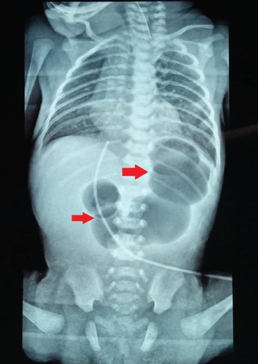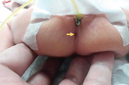 Se coloca en cuna radiante a 37 °C con oxígeno libre a 2 l/min. En la exploración se encuentra permeabilidad de coanas, reflejos primitivos presentes, tórax y abdomen sin compromisos, cadera estable, llenado capilar de 3 segundos, fontanela anterior de 1 cm aproximadamente y posterior parcialmente cerrada; no se encuentra fosa anal (Fig. 1) y existe impedimento para el paso de la sonda orogástrica. Se realiza una radiografía toracoabdominal anteroposterior que evidencia una imagen característica en cuádruple burbuja y ausencia de aire distal, que hace sospechar atresia intestinal (Fig. 2). Ante estas alteraciones, se decide trasladar a la paciente a nuestra institución pública.