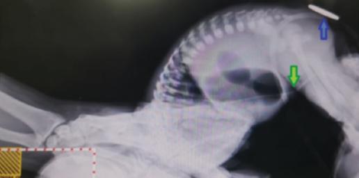 Es intubada antes de iniciar la cirugía y se mantiene así en la unidad de cuidados intensivos neonatales para evitar la dehiscencia de la anastomosis. Se da por terminada la cirugía sin complicaciones ni incidentes, y se realiza una radiografía de control a las 12 horas (Fig. 5).