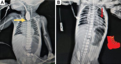 Figura 4 A: esofagograma baritado que muestra un fondo de saco a nivel de la vértebra T2 (flecha). B: radiografía toracoabdominal con imagen característica de «zapato sueco» (flecha).