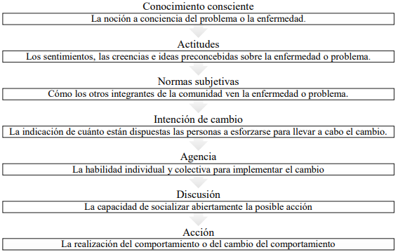 El modelo de Conocimientos, Actitudes, Normas Subjetivas, Intención de Cambio, Agencia, Discusión y Acción (CASCADA) retoma los constructos convencionales de la teoría del comportamiento planificado y del modelo de conocimientos, actitudes y prácticas para medir actitudes y cambios en el comportamiento de la salud buscando generar una acción 15. Según este modelo, una serie de pasos medibles intermedios que, aunque no siempre lineales ni pueden predecirse a priori, se encuentran entre el conocimiento y el cambio del comportamiento. Los elementos o variables intermedias de CASCADA son Conocimiento consciente, Actitudes, Normas subjetivas, Intención de cambio, Agencia, Discusión y Acción, (Figura 1).