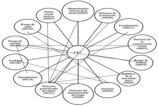 En cuanto a la valoración de la persona mayor F.L.R., de acuerdo con los datos significativos encontrados y el razonamiento clínico se identificaron 14 etiquetas diagnósticas de las cuales 11 fueron reales y 3 de riesgo, (Figura 1).