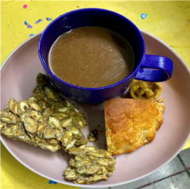 Eran las 07:00 a.m. del domingo de carnaval, se escuchaba los tambores y la marimba en la cowuiná, al acercarnos a un prioste nos sirvió pan artesanal, un vaso de cacapote, acompañado de puczinú y pon zoqui, con ellos venía una bolsa de plástico, él nos indicio que se sirve todas las mañanas a los visitantes durante los cuatro días del carnaval.