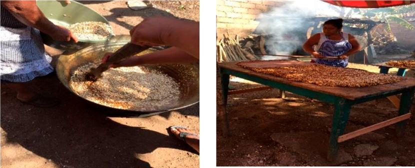 Al conversar con una de las señoras, nos explicó el proceso para preparar el dulce de pepita. Primero, se cuece la panela con agua en una tina grande a fuego alto, utilizando leña para asegurar que rinda bien. Cuando la mezcla alcanza su primer hervor, se añade inmediatamente la semilla de pepita, sin dejar de moverla con una pala de madera larga y gruesa para soportar la temperatura. Luego, se retira del fuego y se extiende sobre una mesa de madera previamente humedecida para evitar que la mezcla se pegue y permitir que se compacte como una palanqueta. Posteriormente y al enfriarse la mezcla, se empiezan a cortar las piezas del mismo y se colocan en cajas para irse sirviendo durante los días del carnaval.