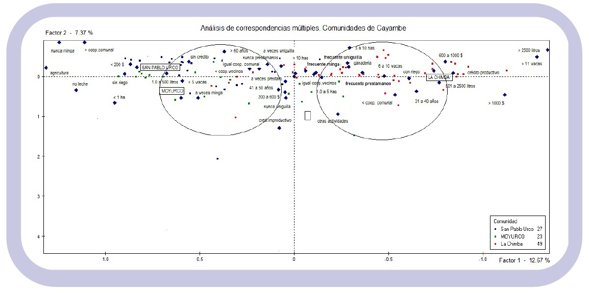 En primer lugar, hay un importante proceso de diferenciación social tanto dentro de las comunidades como entre ellas, debido principalmente al diverso nivel de acceso al capital económico, concentrado en las familias que poseen agua de riego, lo que les facilita el cultivo de pastos y el desarrollo de la ganadería de leche. El eje x del gráfico 1, indica la importancia del capital económico en el espacio social y se constata que la comunidad La Chimba se ubica más hacia la derecha, donde se sitúan variables económicas importantes, como el acceso a más tierra, agua de riego, mayor número de vacas, mayor producción de leche, crédito productivo y más ingresos. Hacia la izquierda del gráfico 1, se ubican las comunidades de Moyurco y San Pablo Urco, con menos tierra y sin riego, lo que obstaculiza el desarrollo de la ganadería de leche, es decir, tienen poco capital económico, pero también un débil capital social.