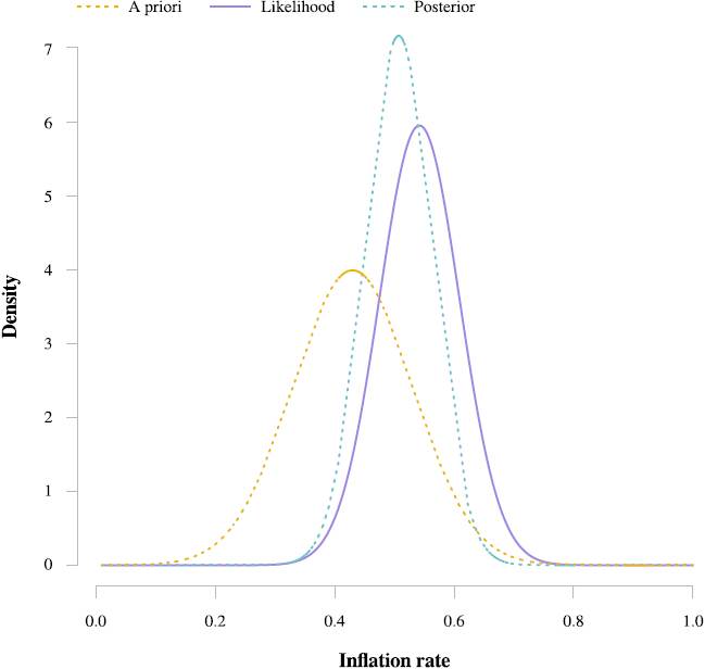 La línea azul punteada muestra la curva de densidad de la distribución a priori, que representa las creencias iniciales sobre la tasa de inflación. Esta distribución está centrada en torno a una tasa de inflación aproximada del 0.4 o 40%. La línea gris continua representa la curva de densidad de la verosimilitud, que refleja la probabilidad de los datos observados para diferentes tasas de inflación, centrada en torno a una tasa de inflación de aproximadamente 0.55 o 55%.