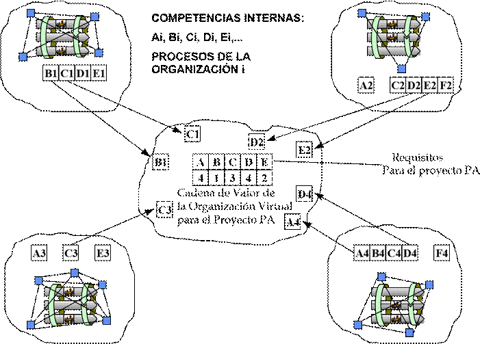 La Figura ilustra el modelo de negocio en el que los socios combinan sus competencias propias para ofrecer al mercado productos o servicios de la forma más eficiente y eficaz posible, así como para poder diferenciarse de la competencia. Una vez que se ha detectado una oportunidad de mercado, la OV tiene que proporcionar un conjunto de recursos de los que no se dispone internamente.