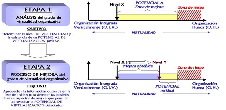 Proceso de mejora del grado de Virtualidad Organizativa: este análisis de “status quo” en virtualidad permite identificar nuevos objetivos, estrategias y acciones, que permitan a la organización mejorar su nivel o estado de virtualidad. Es esta “posibilidad de mejora en virtualidad” a la que se hace referencia cuando a lo largo de este trabajo de tesis se habla de “potencial de virtualización”.