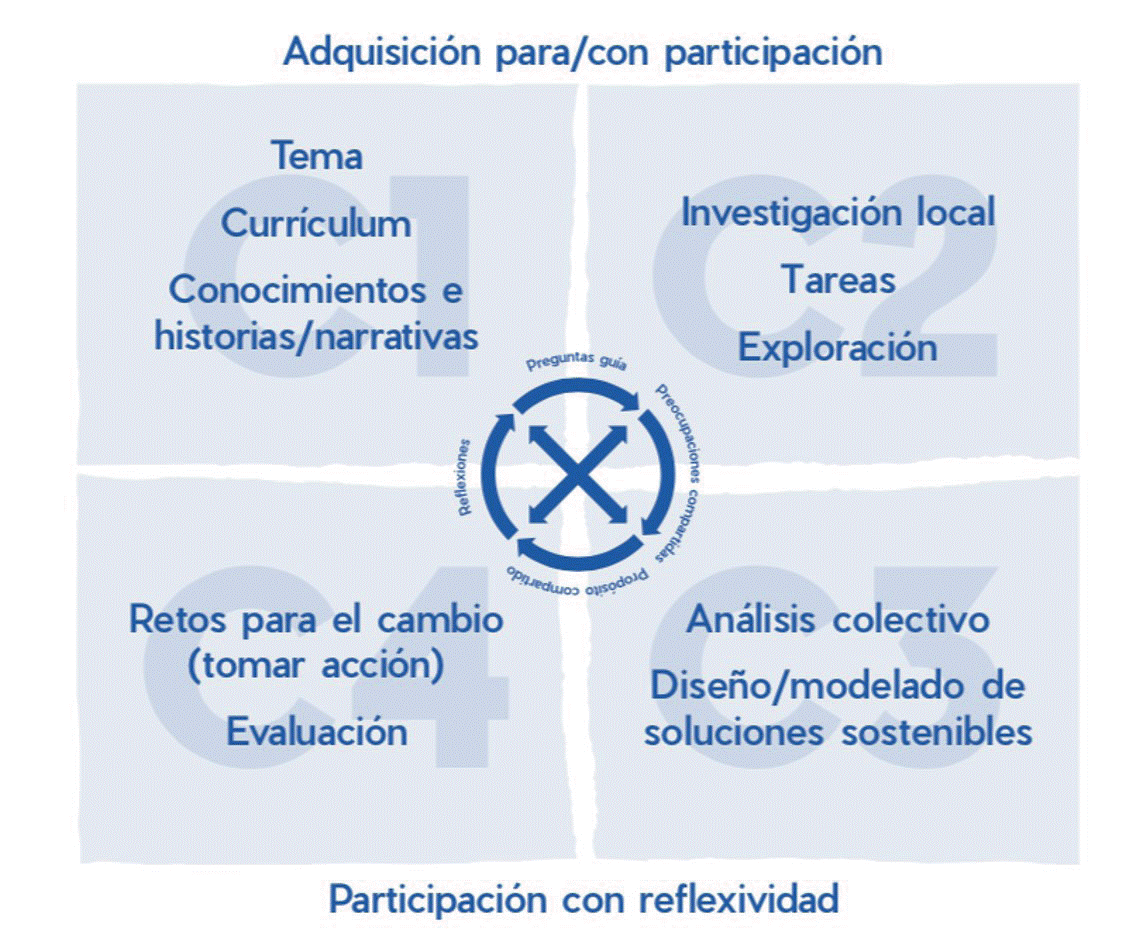 Consisten en secuencias de cuatro cuadrantes que propician un aprendizaje situado, activo y en conexión con el entorno social y ecológico donde se ubica la escuela (ver Figura 1). En el cuadrante 1, se inicia con una narrativa creada por el/la docente que parte de las preocupaciones y conocimientos locales que identificó y que busca, con el poder de las historias, situar el tema central evocando también a la emoción, la experiencia vivida y la conexión afectiva con lo que preocupa. Asimismo, incluye un apartado llamado “Sabías que…”, que articula conocimientos escolares de todas las asignaturas/campos formativos del currículum y con conocimientos locales investigados y relacionados con el tema de la progresión. La articulación de aprendizajes de distintas disciplinas en la progresión se fundamenta en la necesidad de conocer y transformar una realidad compleja que trasciende segmentaciones y jerarquizaciones propias de las ciencias. El cuadrante 2 se orienta a la indagación de los y las estudiantes en el contexto comunitario sobre el tema tratado a partir de sus propias preguntas y así profundizar en los conocimientos y prácticas de cuidado a nivel local, para su posterior conexión con conocimientos y prácticas que emergen desde otros contextos y epistemologías. En el cuadrante 3, se analiza colectivamente lo que se indagó, se profundiza a través de los “Sabías que…” y se planifican acciones que permitan afrontar retos para el cambio que puedan ser asumidos. Los “retos para el cambio” se ubican en el cuadrante 4 y se orientan a realizar transformaciones en escalas factibles en los ámbitos escolar, familiar y comunitario, a corto o largo plazo, que posibiliten también un aprendizaje activo y transformador orientado a desarrollar prácticas de cuidado (Sandoval et al., 2021).
