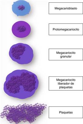 En condiciones normales, el recuento plaquetario se encuentra entre 150,000-450,000/μL y la regulación de este proceso se lleva a cabo por la trombopoyetina (TPO) y su receptor (TPOR) sobre las células de este linaje, así como otras citoquinas como interleucinas 6 y 11 (IL-6, IL-11). Este proceso de trombopoyesis dura aproximadamente siete días en la médula ósea a partir de los megacarioblastos, que se transforman en protomegacariocitos y más tarde éstos en megacariocitos; finalmente, estos últimos se escinden en fragmentos citoplasmáticos: las protoplaquetas. A partir de un megacariocito se originan seis protoplaquetas que dan lugar a su vez a 6-12 × 103 plaquetas (Figura 1).