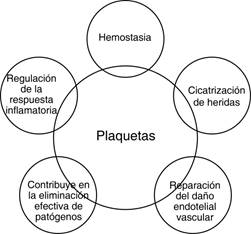 Figura 2: Funciones de las plaquetas. Entre sus múltiples funciones se encuentra la participación en procesos de cicatrización, hemostasia, funciones inmunológicas y mediadores de respuesta metabólica al estrés.