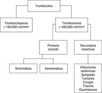 Figura 3: Clasificación de trombocitosis. Las trombocitosis se dividen en primarias y secundarias, siendo su etiología distinta. Las trombocitosis primarias son de origen mieloproliferativo, mientras que las secundarias tienen su origen en procesos inflamatorios.