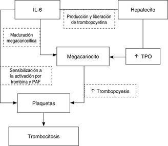Se ha demostrado que la IL-6 promueve la maduración megacariocítica in vitro. In vivo, la IL-6 tiene efectos sobre los megacariocitos, como el aumento del tamaño, la ploidía y la producción de plaquetas. Además, altera la función plaquetaria al sensibilizarlas a la activación por trombina y el factor activador de plaquetas. Finalmente, la IL-6 también actúa directamente sobre los hepatocitos para estimular la producción y liberación hepática de TPO. Por lo tanto, la influencia de la IL-6 sobre las plaquetas parece estar relacionada directamente con la trombocitopoyesis, más que con el aumento de la vida de las plaquetas o con la disminución de su secuestro esplénico.7,8