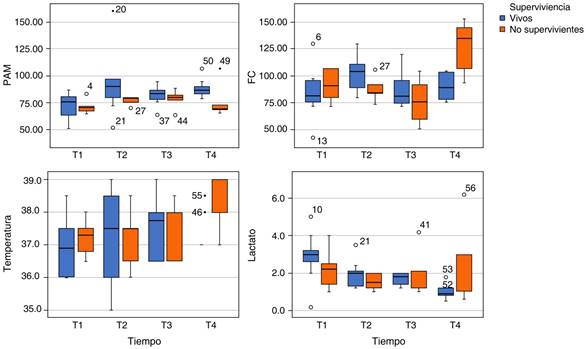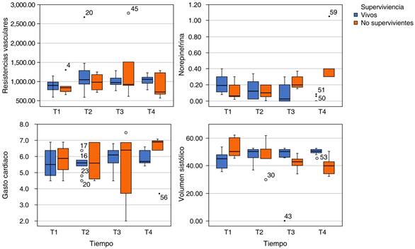 Se identificaron como T1 a T4 las diversas etapas del protocolo; se registró y se calcularon todas las variables al diagnóstico a su ingreso nombrando como T1, a las 24 horas como T2, a las 72 horas como T3 y a su egreso de unidad de cuidados intensivos como T4. Se evaluó si la disfunción autonómica se correlaciona con otros marcadores de gravedad como las escalas SOFA y APACHE II, así como con mayor requerimiento de dosis de vasopresor o la necesidad de segundo o tercer fármaco, su asociación con taquicardia, fiebre o diaforesis, así como desenlaces.