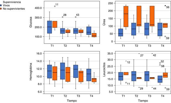 Figura 2: Distribución de parámetros de laboratorio de los pacientes en diferente etapa del estudio.