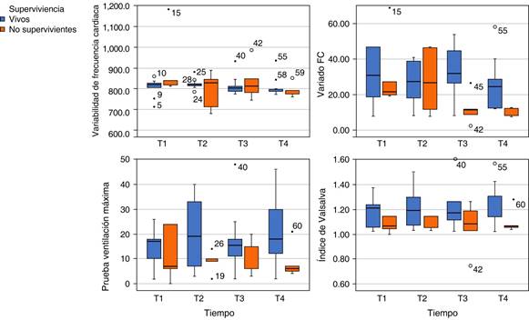 Se realizó medición de índices de disfunción del sistema nervioso autónomo a la muestra de estudio (Figuras 1 a 4): al ingreso, a las 24 horas, a las 48 horas y a su egreso de la unidad de cuidados intensivos. De la prueba de ventilación máxima, el índice de Valsalva y la variabilidad de la frecuencia cardiaca, hallamos que los sujetos con desenlace por supervivencia no presentaron alteración en los valores de referencia; y en el grupo de sujetos con desenlace por defunción, tuvieron descenso en los mismos, también se observó que tuvieron cambios desde el inicio del estudio. Se encontró que a las 24 horas presentó una caída significativa de la variabilidad de la frecuencia cardiaca, índice de Valsalva y varianza de la frecuencia cardiaca.