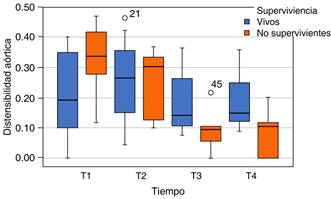 A las pruebas de la variabilidad de la onda E del flujo transmitral, se integró la distensibilidad de la aorta (Figura 5) en la cual también se encontraron cambios significativos en las 24 horas de su diagnóstico en 30% de los pacientes; a pesar de mejorar la PAM con manejo vasopresor, persistía con cambios con descenso significativo en el grupo de no supervivientes, ameritando tratamiento con segundo vasopresor e inotrópico, lo que podría relacionarse con una disminución del flujo simpático a la vasculatura, probablemente por vasodilatación atribuida a sepsis.