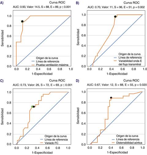 Figura 6: Análisis por curva ROC. A) Prueba de ventilación máxima. B) Variabilidad de onda E. C) Variado de frecuencia cardiaca [FC]. D) Distensibilidad aórtica.