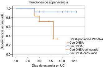 En la curva de supervivencia global (Figura 7) se observa que, al no presentar incremento en la distensibilidad aórtica como indicador de disfunción nervo-vascular, después de 15 días respecto al ingreso a la unidad de cuidados intensivos la supervivencia fue poco más de 60%.