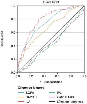 El ILA obtuvo un AUC de 0.790 (IC95% 0.742-0.838); SOFA de 0.742 (IC95% 0.690-0.795); IPL de 0.441 (IC95% 0.379-0.503) SAPS III de 0.669 (IC95% 0.611-0.727); y el ratio ILA/IPL de 0.444 (IC95% 0.381-0.506) (Figura 1 y Tabla 2).