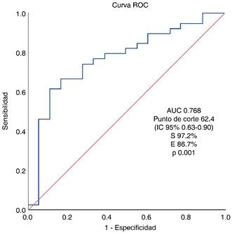 El punto de corte obtenido para determinar los resultados adversos fue de 62.4 con área bajo la curva (AUC) de 0.768 (IC95%: 0.63-0.90), sensibilidad de 97.2% y especificidad de 86.7% (p = 0.001) (Figura 1). y un riesgo estimado de 4.7 (IC95% 0.40-56.1).