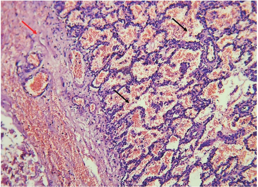 Figura 1 Figura 1. Imagen microscópica teñida con H&E en panorámica (4x) que muestra zonas periféricas del proceso neumónico. Observe los espacios alveolares con extensa hemorragia reciente (flechas negras), adyacente a una de engrosamiento pleural con congestión vascular (flecha roja).