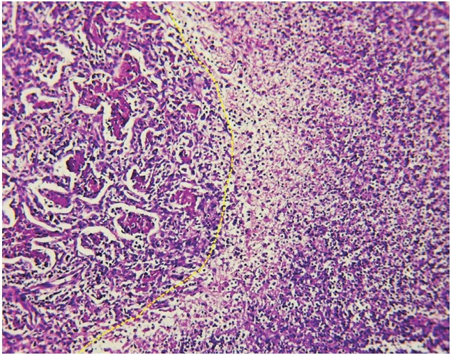 Figura 2 Figura 2. Imagen microscópica con H&E en seco débil (10x) en donde se puede apreciar una zona de transición del proceso neumónico entre zonas de neumonía en vías de organización (lado izquierdo) y zonas necrotizantes de la misma (lado derecho). Observe la pérdida de arquitectura alveolar en la zona necrótica y los agregados fibrinoides intraalveolares de la zona en organización.